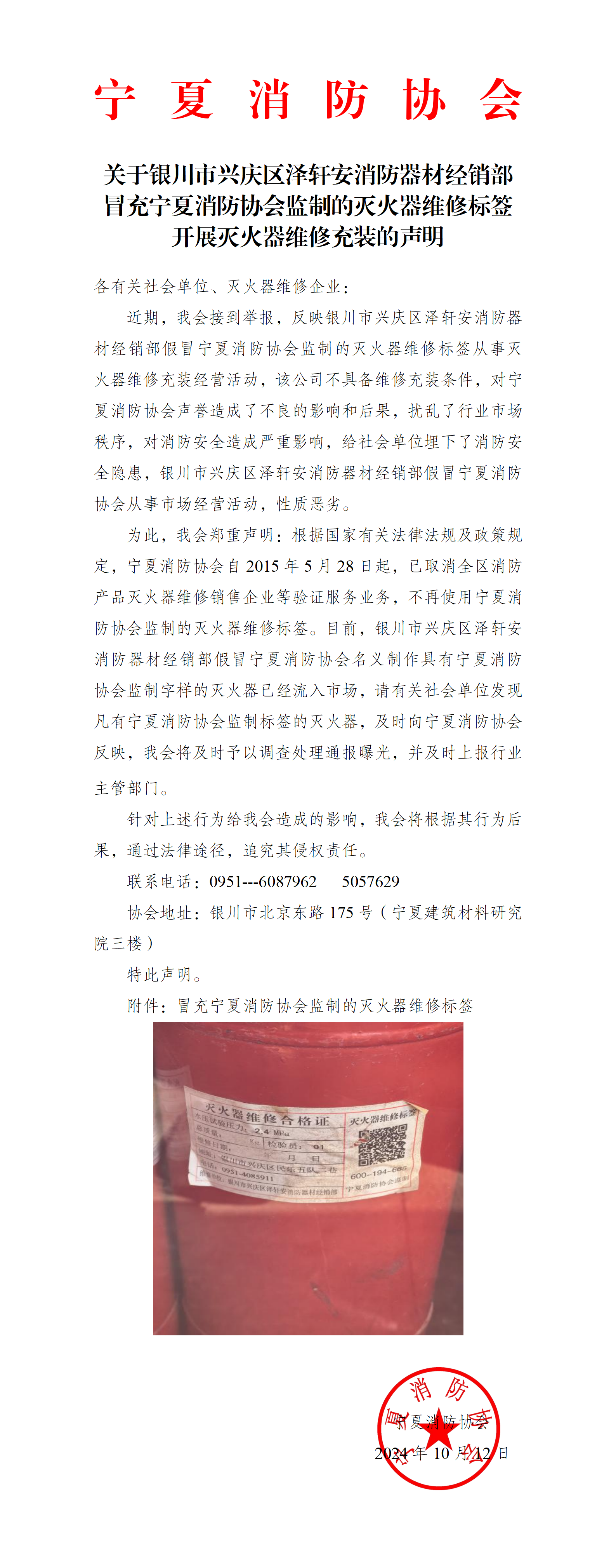 关于银川市兴庆区泽轩安消防器材经销部冒充5630福彩网监制的灭火器维修标签开展灭火器维修充装的声明