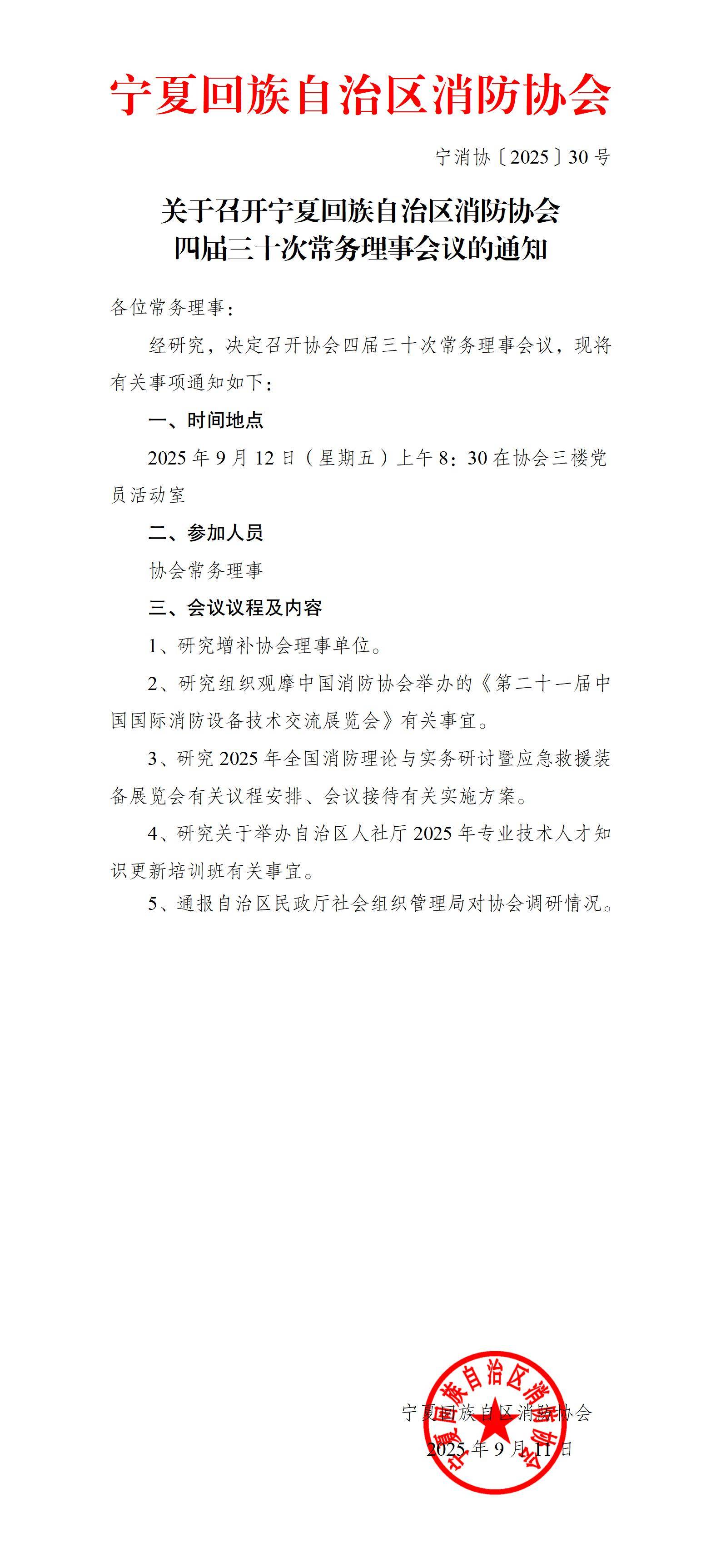 关于召开宁夏回族自治区消防协会 四届三十次常务理事会议的通知