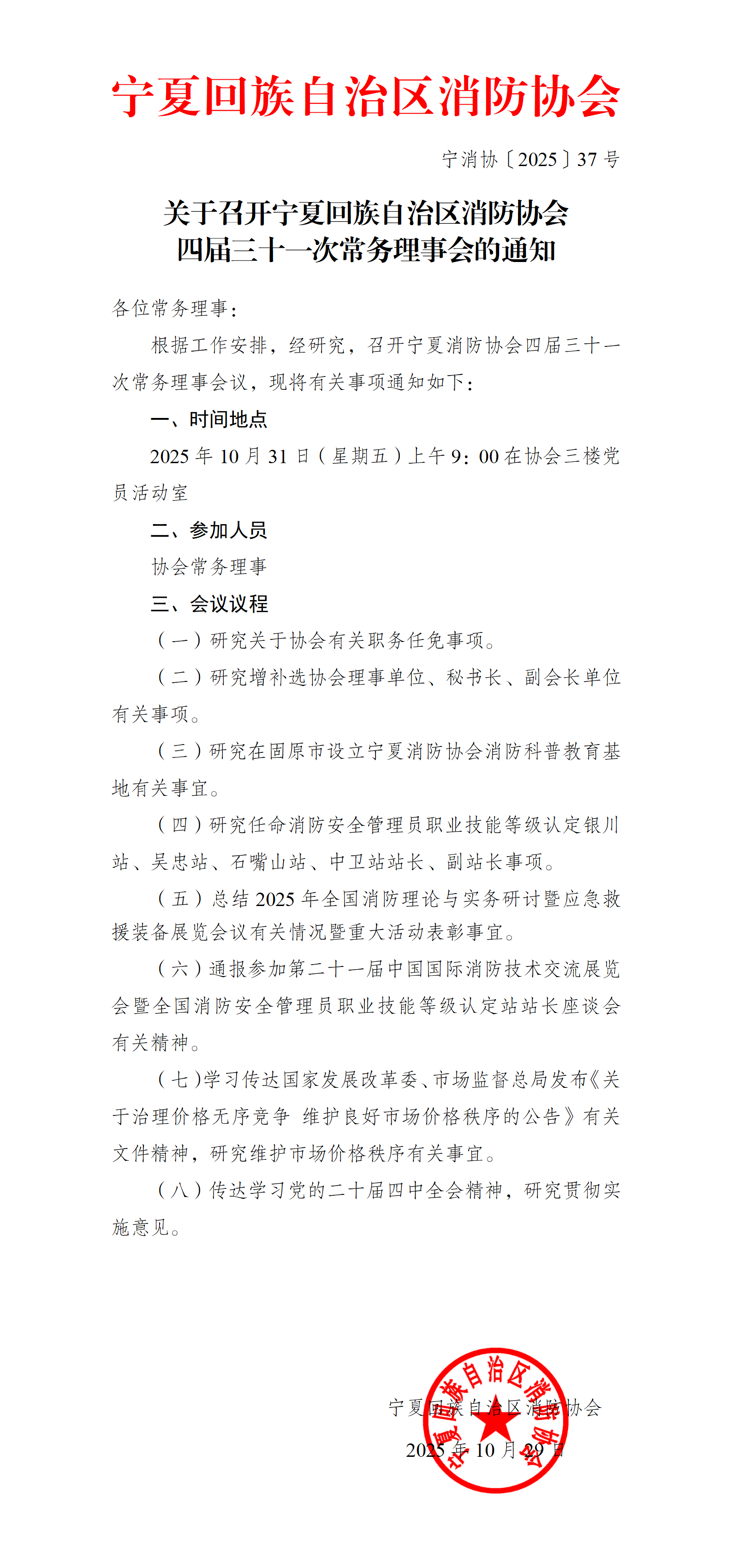 关于召开宁夏回族自治区消防协会四届三十一次常务理事会的通知