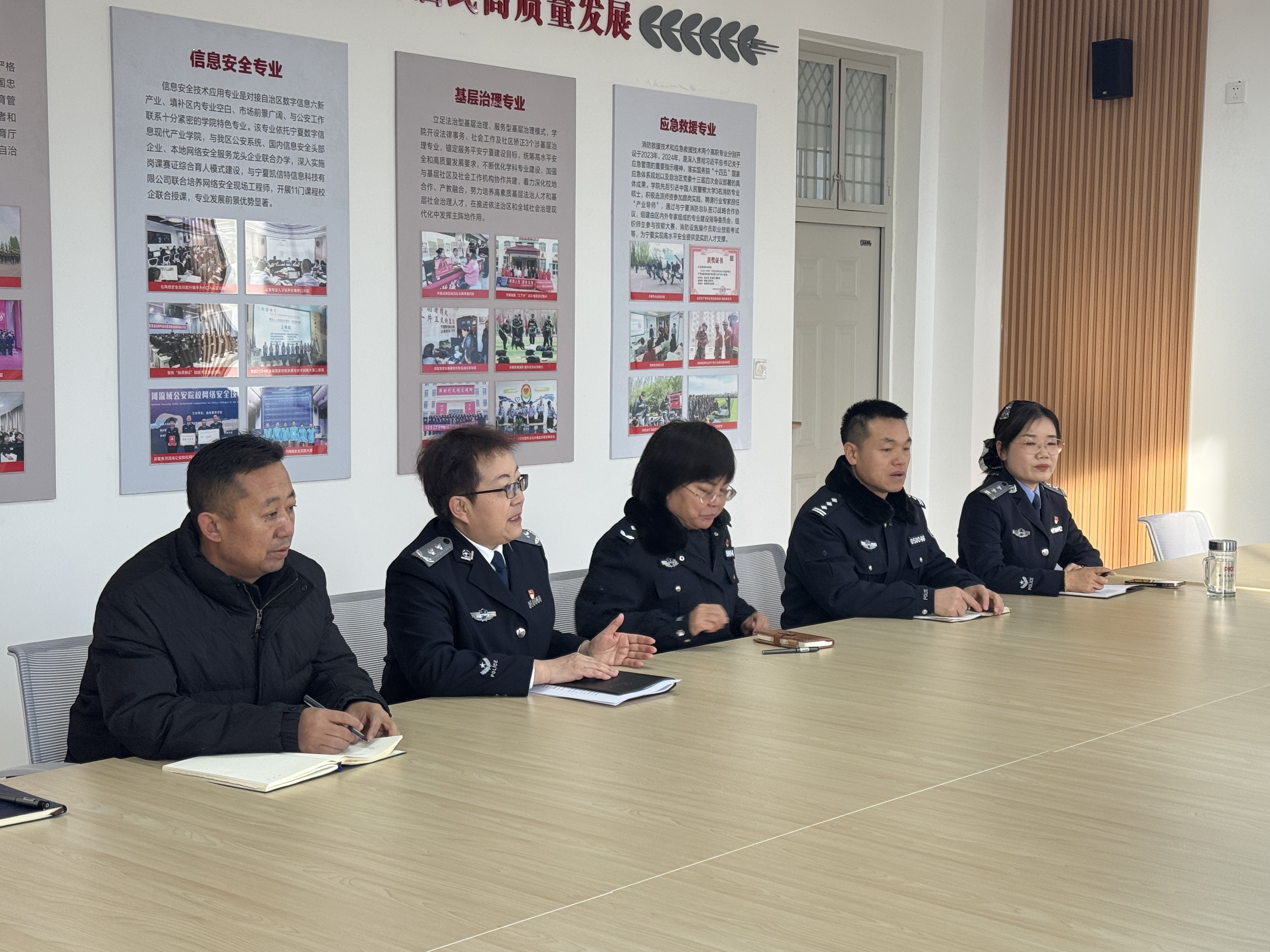 宁夏警官职业学院党委委员、副院长孙群伟代表学院对协会一行及专家的到来表示热烈欢迎。学院中职部主任及教工党支部书记史伟丽主持会议,并介绍了学院出席人员,包括中职部党总支书记蔡恩华、副书记李伟、应急专业教研室主任郑立芸及教师代表徐扬。