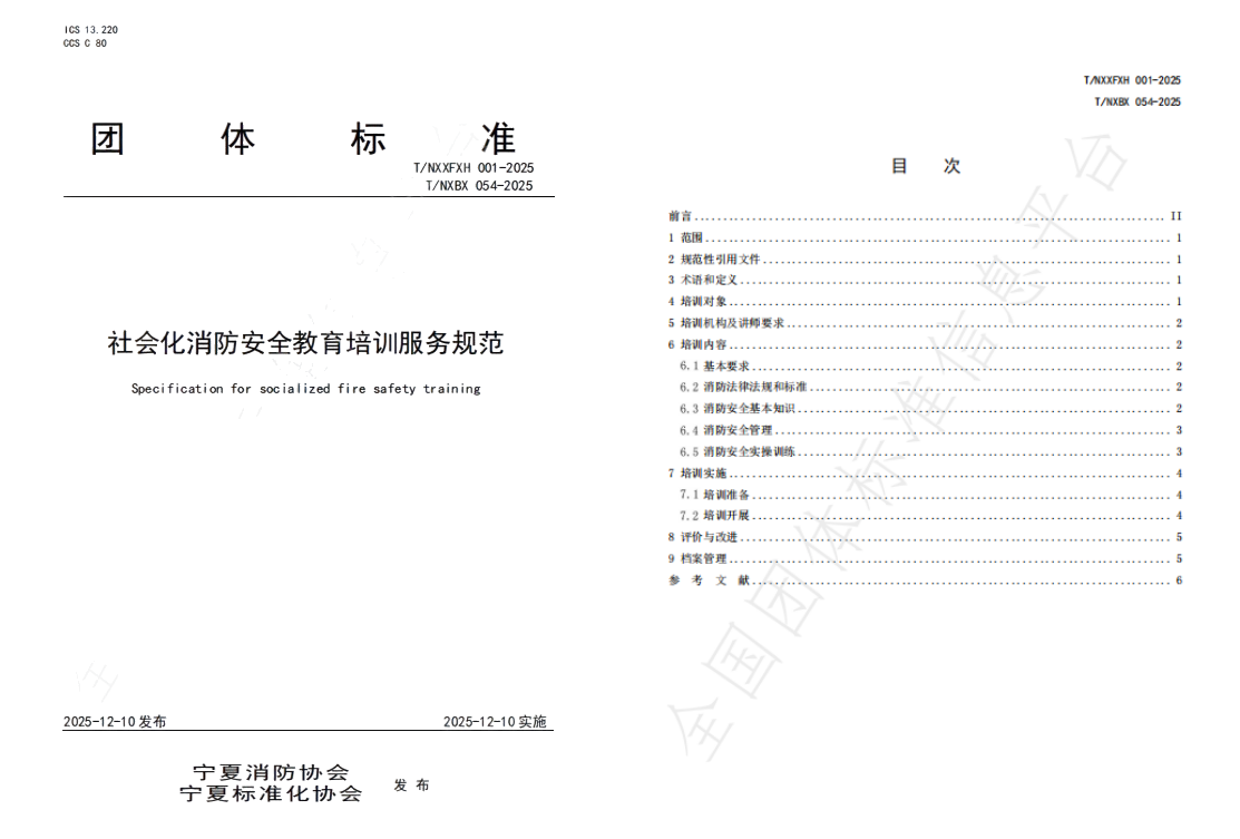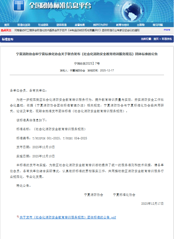 为进一步规范我区社会化消防安全教育培训服务行为,全面提升消防安全教育培训的质量与实效,筑牢消防安全工作社会化根基,5630福彩网依据《5630福彩网团体标准管理办法》,联合宁夏标准化协会,于2025年12月10日正式发布《社会化消防安全教育培训服务规范》(标准编号:T/NXXFXH 001-2025、T/NXBX 054-2025)团体标准。